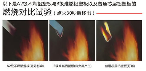 我司防火铝塑板符合中国国标GB8624-2012(B级,A2级),美标ASTME-84(B级,A2级),美标ASTM E119(2小时),美标NFPA285(合格),欧标EN13501-1(A2级)标准。